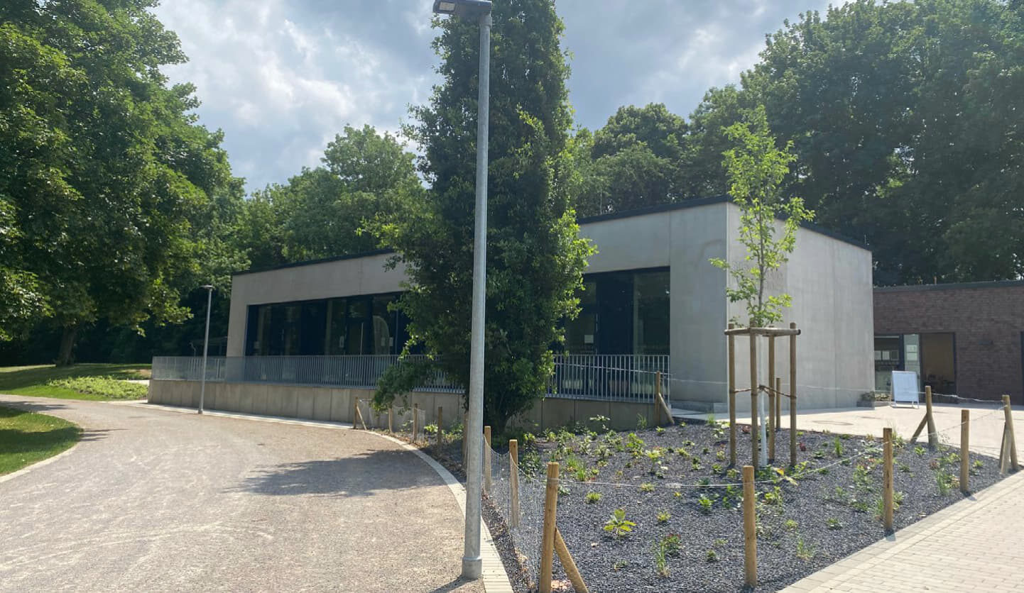 Auf einer Fläche von 400 qm ist eine eingeschossige barrierefreie Begegnungsstätte entstanden, deren bodentiefe Fensterfront gen Volkspark ausgerichtet ist. Im Inneren des modernen Gebäudes befinden sich neben Büro-, Sanitär- und Lagerräumen, eine Kaffeeküche, ein Sitzungsraum sowie ein großer (teilbarer) Multifunktionsraum mit Platz für Beratungs-, Kurs- und Freizeitangebote aller Art. Im Außenbereich blickt man von der Terrasse direkt in den Volkspark Batenbrock und auf den nahegelegenen Spielplatz.